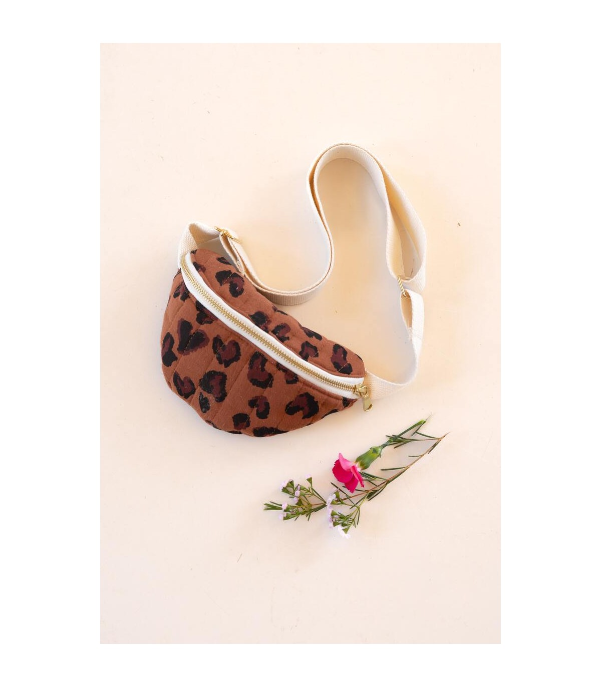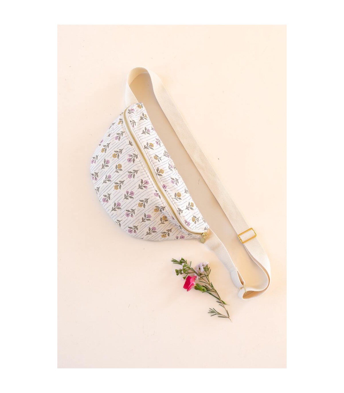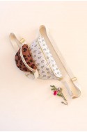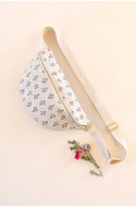Ajoutez en option la bouclerie dorée qui contient: 1 boucle de réglage, 1 mousqueton et 1 étrier assortis + le tissu nécessaire pour la bandoulière.